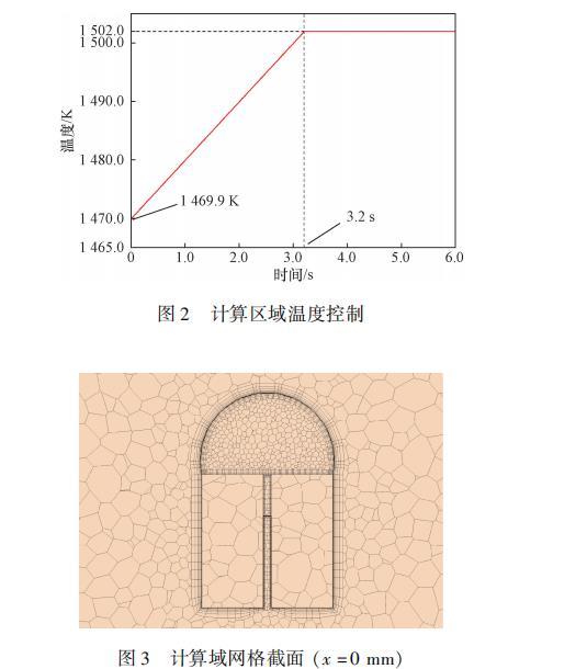 計算域網(wǎng)格截面(x=0mm)如圖3所示,整體上采用多面體網(wǎng)格,在釬料涂覆區(qū)域內(nèi)外均設(shè)置邊界層網(wǎng)格,為準確捕捉多余釬料在母材表面的流失過程,對母材表面的網(wǎng)格進行加密。