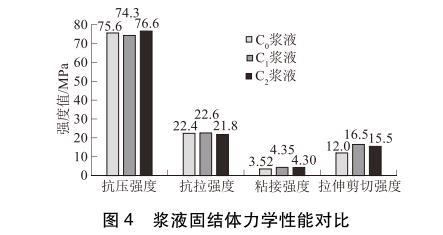 3種漿液固結體力學性能對比見圖4。由圖4可以看出:3種漿液固結體抗壓強度和抗拉強度數值差別不大,說明表面活性劑對漿液固結體的抗壓強度和抗拉強度無影響。但C1、C2漿液的粘接強度和拉伸剪切強度明顯高于C0漿液的粘接強度和拉伸剪切強度。其中C1漿液的粘接強度和拉伸剪切強度比C0漿液分別提高了23.6%和37.5%;C2漿液的粘接強度和拉伸剪切強度比C0漿液分別提高了22.2%和29.2%。其原因在于表面活性劑的加入降低了漿液的接觸角,使漿液有更好的浸潤性和潤濕性,從而提高了漿液的粘接強度和拉伸剪切強度。
