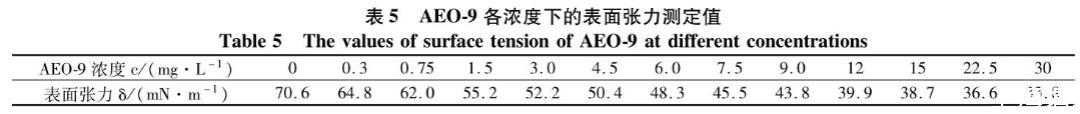脂肪醇聚氧乙烯醚(AEO-9)是一種非離子表面活性劑,該類表面活性劑是非離子表面活性劑中發展最快、用量最大的品種。AEO-9試樣的表面張力測定結果見表5。