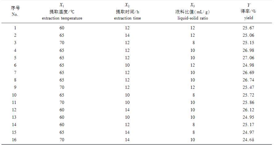 通過軟件分析得到肥皂莢皂苷的最優(yōu)提取條件為:溫度69.20℃、時(shí)間11.28 h、液料比值9.89,皂苷得率的預(yù)測值為26.44%。為了操作方便,修正提取條件為:溫度69℃、時(shí)間11 h 15 min、液料比值為10。在此條件下對(duì)肥皂莢皂苷進(jìn)行水浸提,并做3次重復(fù)性實(shí)驗(yàn),平均得率為26.49%,與理論值誤差僅為0.05%。表明該模型可以較好地預(yù)測肥皂莢皂苷的提取工藝。