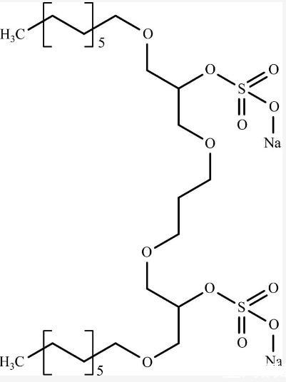 親油基碳數過高或過低的表面活性劑的起泡能力都不高,12個碳的直鏈親油基有利于提高半衰期,增強泡沫穩定性。煤表面存在含氧官能團,包括醇、醚、酚、酯、羧基,可使煤粒子表面帶負電荷。陽離子型表面活性劑由于氫鍵和靜電的雙重作用可被煤表面選擇性吸附,吸附強度高,不利于其在煤巖表面脫附。而陰離子型表面活性劑可通過氫鍵作用力吸附在煤巖上,但引入的負電基團的靜電斥力會減弱其與煤層的氫鍵作用,使其排水降壓開采時易于脫附,有利于儲層保護。基于上述原理,創新設計的新型雙子起泡劑ULT-1的分子結構見圖1。