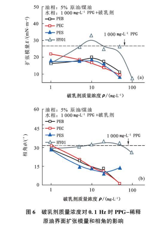 圖4不同頻率條件下PES對PPG-稀釋原油界面擴(kuò)張模量和相角的影響