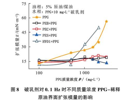 圖8破乳劑對0.1 Hz時(shí)不同質(zhì)量濃度PPG-稀釋原油界面擴(kuò)張模量的影響