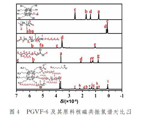 圖4為PGVF-6以及其原料的核磁共振對比圖。PGVF-6譜圖中,SH-POSS上的-SH質子氫吸收峰已經消失,接枝成功的APEG750單體,烯烴雙鍵的質子氫吸收峰已經消失,末端連接的-OH質子氫吸收峰在5.21times 10^{-6}處;同樣反應成功的2-壬烯酸甲酯單體,烯烴雙鍵的質子氫吸收峰也同樣消失不見,連接O的末端烷烴-CH3質子氫吸收峰處于3.72x10-6的位置,末端烷烴-CH3的質子氫吸收峰在0.88x10-6處;最后成功反應的VDMS單體,烯烴雙鍵的質子氫吸收峰也已經消失,后續Si上連接的所有甲基-CH3分別處在0.12x10-6和0.08x10-6處,可以得知PGVF-6雜化材料成功合成。