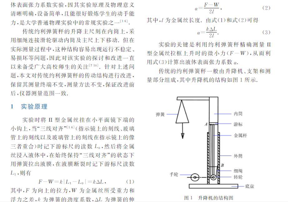 約利彈簧秤是一種精細(xì)彈簧秤,常用來測(cè)定微小的力。利用約利彈簧秤采用拉脫法測(cè)量液體表面張力系數(shù)實(shí)驗(yàn),因其實(shí)驗(yàn)原理及物理意義清晰明確,設(shè)備簡(jiǎn)單,且能很好鍛煉學(xué)生的動(dòng)手能力,是大學(xué)普通物理實(shí)驗(yàn)中的常規(guī)實(shí)驗(yàn)之一。