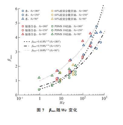 本文在毛細(xì)力區(qū)研究的流體包括水、60%質(zhì)量分?jǐn)?shù)甘油溶液、PDMS10硅油和鎵基合金,βmax隨We變化的情況如圖7所示。對(duì)不同潤(rùn)濕性壁面的模擬結(jié)果進(jìn)行擬合,如圖7中虛線所示:當(dāng)θe=90°時(shí),βmax∝We0.26(R2=0.921);當(dāng)θe=180°時(shí),βmax∝We0.40(R2=0.990);當(dāng)θe=150°時(shí),βmax∝We0.29(R2=0.918),介于前兩者之間。因?yàn)檎鎸?shí)表面無(wú)法絕對(duì)疏水,所以Clanet等實(shí)驗(yàn)研究結(jié)果βmax∝We0.25更接近本文θe=90°的模擬結(jié)果,而Eggers等針對(duì)完全疏水表面提出的βmax∝We0.5更適用于θe=180°的情況。