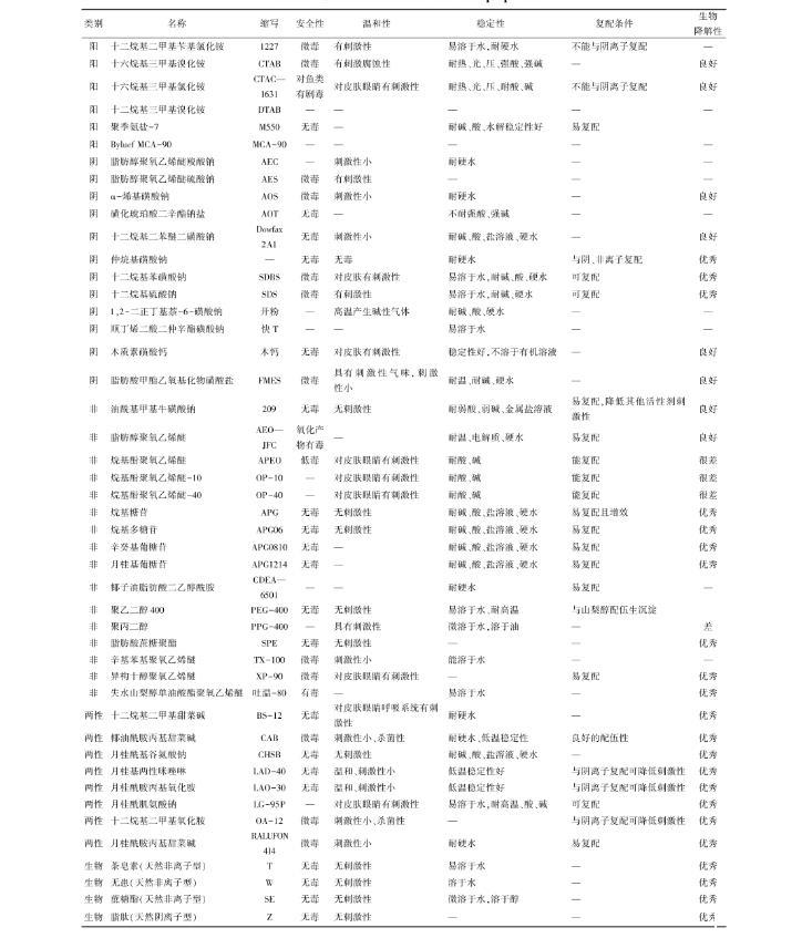 當(dāng)前市面上常用的表面活性劑產(chǎn)品種類豐富、物理化學(xué)性能及用途各有不同。針對(duì)表面活性劑水溶液在提高煤體潤(rùn)濕效果、抑制瓦斯解吸的應(yīng)用現(xiàn)狀,從安全性、溫和性、穩(wěn)定性、復(fù)配條件及生物降解性5個(gè)方面考慮,以中國(guó)知網(wǎng)(CNKI)收錄的文獻(xiàn)資料為基礎(chǔ),搜集到46種常見表面活性劑及其性質(zhì)見表1。