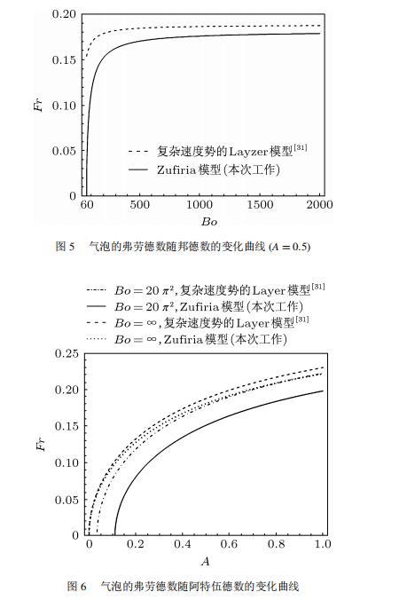 Young等利用復雜速度勢單獨考慮了界面張力對RT不穩(wěn)定性的影響。在此,將本次結果和Young等的結果進行了比較,如圖2所示,實線是本次結果,虛線是Young等人的結果??梢园l(fā)現(xiàn),當邦德數(shù)較小時,界面張力很大,兩種結果所計算的弗勞德數(shù)基本一致;而當邦德數(shù)較大時,界面張力較小,發(fā)現(xiàn)本次工作的結果小于Young等人的結果。