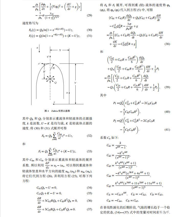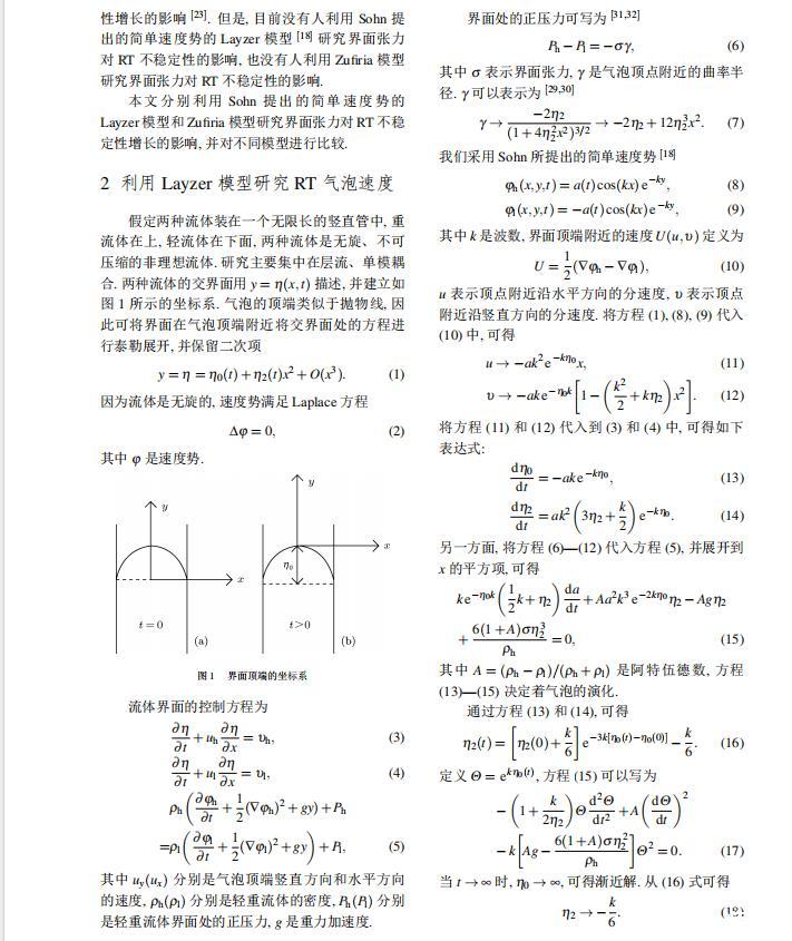 Layzer模型和Zufiria模型都是建立在理想流體之上。然而對實際流體而言,很多因素都可以影響RT不穩(wěn)定性的演化情況,如密度比、黏性、界面張力、壓縮性、外場加速度、Kelvin-Helmholtz不穩(wěn)定性等。Young和Sohn利用Goncharov提出的復雜速度勢,將Layzer模型推廣并應用到非理想流體中,研究了界面張力對RT不穩(wěn)定性增長的影響,發(fā)現(xiàn)界面張力降低了氣泡的增長速率。2011年本文的作者之一利用Zufiria模型研究了黏性對RT不穩(wěn)定性增長的影響。但是,目前沒有人利用Sohn提出的簡單速度勢的Layzer模型研究界面張力對RT不穩(wěn)定性的影響,也沒有人利用Zufiria模型研究界面張力對RT不穩(wěn)定性的影響。