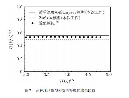 最后,我們將兩種理論模型的結果與數(shù)值模擬進行了比較,如圖7所示。在誤差允許的范圍內(nèi),Zufiria模型和Layzer模型與數(shù)值模擬符合的都很好。由簡單速度勢的Layzer模型得出的結果更接近于數(shù)值模擬。另外,從圖7中還可以看出,簡單速度勢的Layzer模型計算值比數(shù)值模擬結果高,而Zufiria模型比數(shù)值模擬低。這可能由于Zufiria模型假設速度勢是復數(shù)勢,會人為引進速度的耗散,導致結果比數(shù)值模擬低,而Layzer模型的計算值略高于數(shù)值模擬的原因可能由于數(shù)值模擬沒有達到漸近速度。