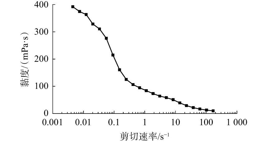 圖7為小段塞的黏度隨剪切速率的變化情況。從圖7可看出,體系黏度隨剪切速率的增加而快速降低,從392.8 mPa·s降至10.3 mPa·s。由于剪切力作用下纏結(jié)的自組裝超分子鏈打開并發(fā)生取向,導(dǎo)致表面活性劑的黏度整體上隨著剪切速率的上升而下降。在低剪切頻率下黏度下降明顯,屬于典型的“非牛頓流體”,但當(dāng)剪切速率進(jìn)一步增大時(shí),黏度下降緩慢。