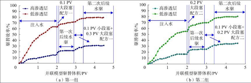 從表1可知,通過并聯(lián)天然巖心表面活性劑驅(qū)油實(shí)驗(yàn)發(fā)現(xiàn),只用大段塞驅(qū)平均提高采收率7.4個(gè)百分點(diǎn),非常低。而采用組合段塞進(jìn)行調(diào)和驅(qū),第一組組合段塞驅(qū)在高低滲層分別提高驅(qū)油效率10.1個(gè)百分點(diǎn)和17.7個(gè)百分點(diǎn)。第二組組合段塞驅(qū)在高低滲層分別提高原油采收率10.2個(gè)百分點(diǎn)和16.1個(gè)百分點(diǎn),兩組組合段塞驅(qū)平均提高采收率為14.8個(gè)百分點(diǎn),比只用大段塞驅(qū)平均采收率提高了1倍,達(dá)到了聚/表二驅(qū)的驅(qū)油效果。
