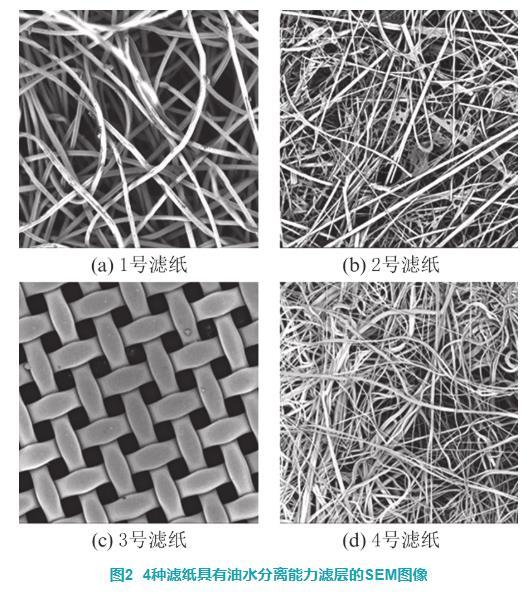 使用Phonem Pro X掃描電子顯微鏡(scanning electron microscope,SEM)在500倍放大倍率下拍攝的4種濾紙的微觀結(jié)構(gòu)如圖2所示。1號濾紙由直徑約為15μm的親水纖維構(gòu)成;2號濾紙的親水層由粗細(xì)不同的纖維通過樹脂粘接而成,其中粗纖維還起到增加親水層物理強度的作用;3號濾紙由直徑約為45μm的聚四氟乙烯纖維絲編制,兩根纖維之間的距離約為44μm;4號濾紙的b層由疏水材料通過熔噴工藝制成,在平面上纖維分布疏密不均但在空間內(nèi)有著較好的孔隙分布。除了3號濾紙外,其余濾紙均具有油水分離層,同時也具有較為復(fù)雜的空間結(jié)構(gòu)。