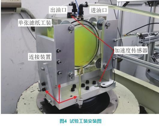 單張濾紙工裝由兩塊50 mm厚的有機玻璃制成,在頂部加工進(jìn)出油口,在底部加工放水口。單張濾紙工裝和振動試驗臺通過一個特制的鋁質(zhì)底座進(jìn)行連接,如圖4所示。