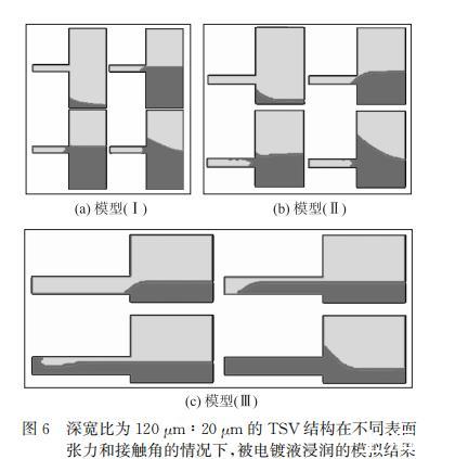 模型(I)使用的表面張力和接觸角為不含活性劑的TSV標準鍍液的實際測量值,仿真結果是不能完全浸潤;模型(II)采用的是在1L TSV標準鍍液中加入20mL活性劑溶液的實際測量值,這兩種模型在仿真中均表現為不能完全浸潤。