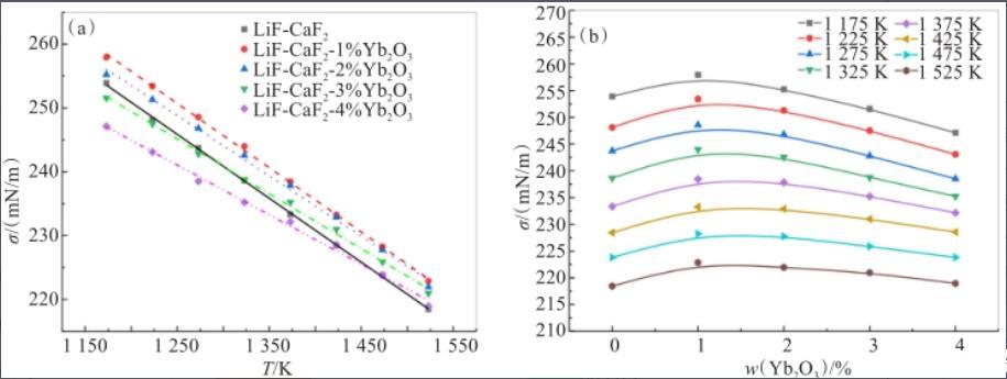 圖3溫度(a)和Yb2O3含量(b)對(duì)LiF-CaF2熔鹽體系表面張力的影響