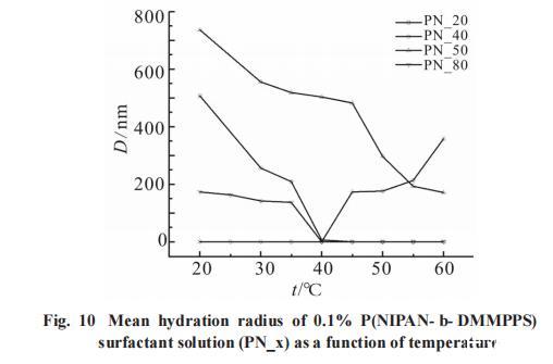 從Fig.10可以觀察到,低溫條件下,PN_20的平均水合半徑大約為500nm,PN_50的水合半徑在750nm左右。此階段,這2種聚合物均形成了膠束結構,并從水溶液中析出。當溫度升高時,兩者的水合半徑均表現(xiàn)出明顯的減小趨勢,表明它們在水中的溶解度增加。特別地,對于PN_50而言,激光納米粒度儀的測量結果顯示,其水合半徑發(fā)生突變的溫度區(qū)間位于40℃至45℃之間。這一發(fā)現(xiàn)指出,PN_50在該溫度范圍內經歷了熱敏性質的顯著變化,可能由于溫升引起的聚合物鏈構象改變或膠束結構的解離。相反,PN_40低溫時平均水合半徑接近于0,溶解性較好,而高溫時其水合半徑逐漸增大,接近400nm,從溶液中析出。其中PN_40所測得的LCST與透光率結果一致。隨著溫度升高,PN_20和PN_80分子在溶液中形成大的聚集體,激光粒度儀測定的是上清液的粒徑,因此粒徑變小,甚至觀察不到納米粒子。